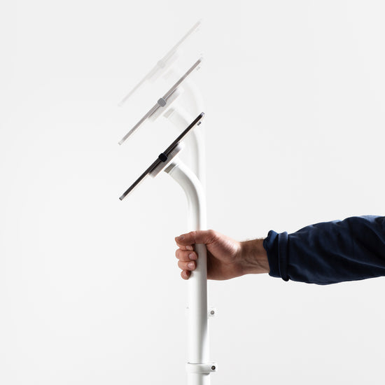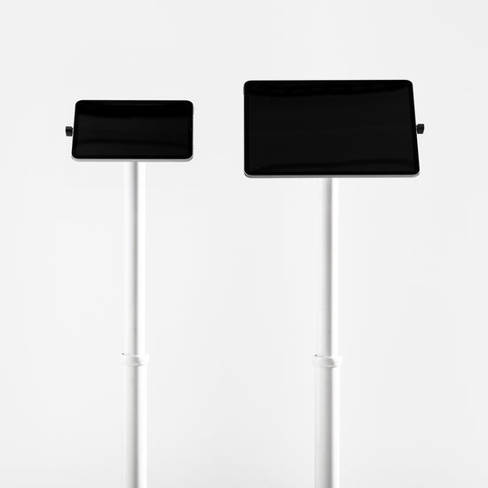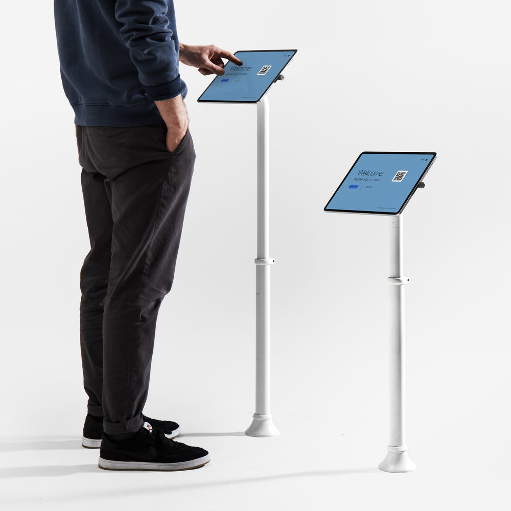 The Bouncepad Core Elevate Slim is a sleek, height-adjustable (from 78cm to 117cm to the center of the screen) tablet floor mount with a compact footprint. It's great for modern retail, hospitality, and business spaces. Its minimalist, open-access design keeps your setup neat and tidy. Set the height during installation for standing or seated interactions.
