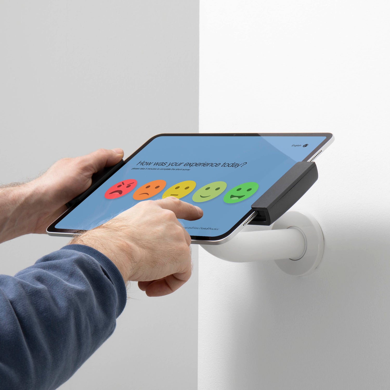 The Clip Branch is a wall-mounted tablet holder designed for installations where a lower viewing angle is preferred. It features Bouncepad’s spring-loaded Clip jaw system, which holds the tablet in position, with an optional security screw included to lock the jaws in place when required.