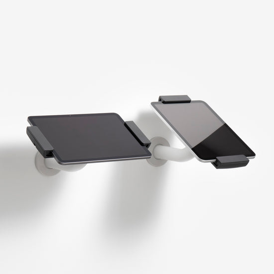 The 30 degree wall-mounted arm positions the tablet closer to the user, while the jaws can be assembled to display the screen in either portrait or landscape orientation.