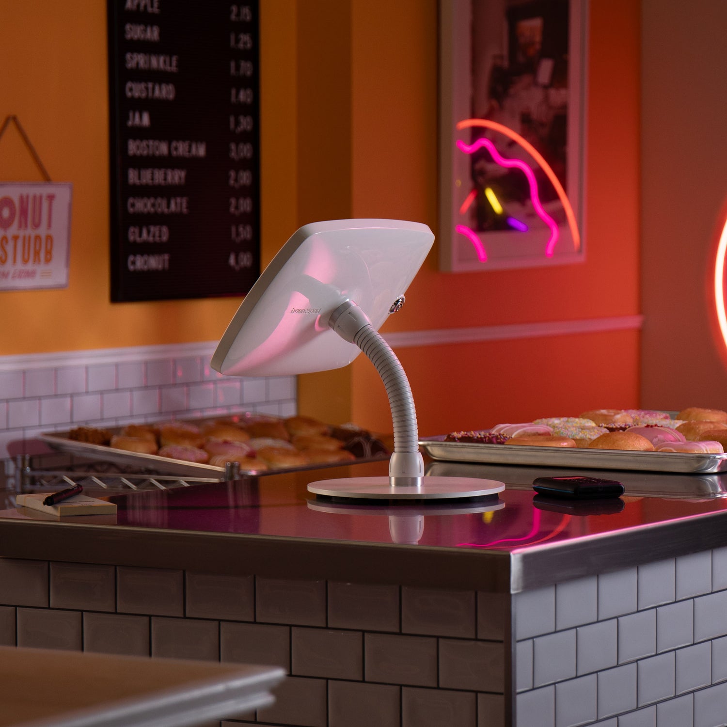 Flexible gooseneck mounting arm allows you to twist and turn this Pad kiosk into an position.
