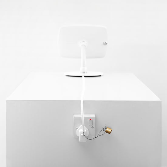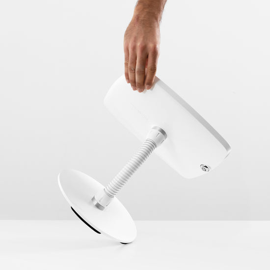 • Bouncepad Counter Flex - A secure tablet & iPad gooseneck stand in white.