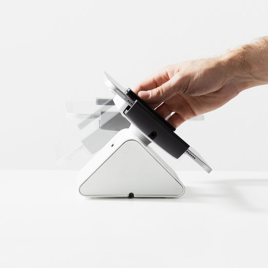 The Clip Flip is a professional tablet holder designed for commercial counters where the screen needs to be shared between staff and customers. It features Bouncepad’s spring-loaded Clip jaw system, which holds the tablet in position, with an optional security screw included to lock the jaws in place when required.