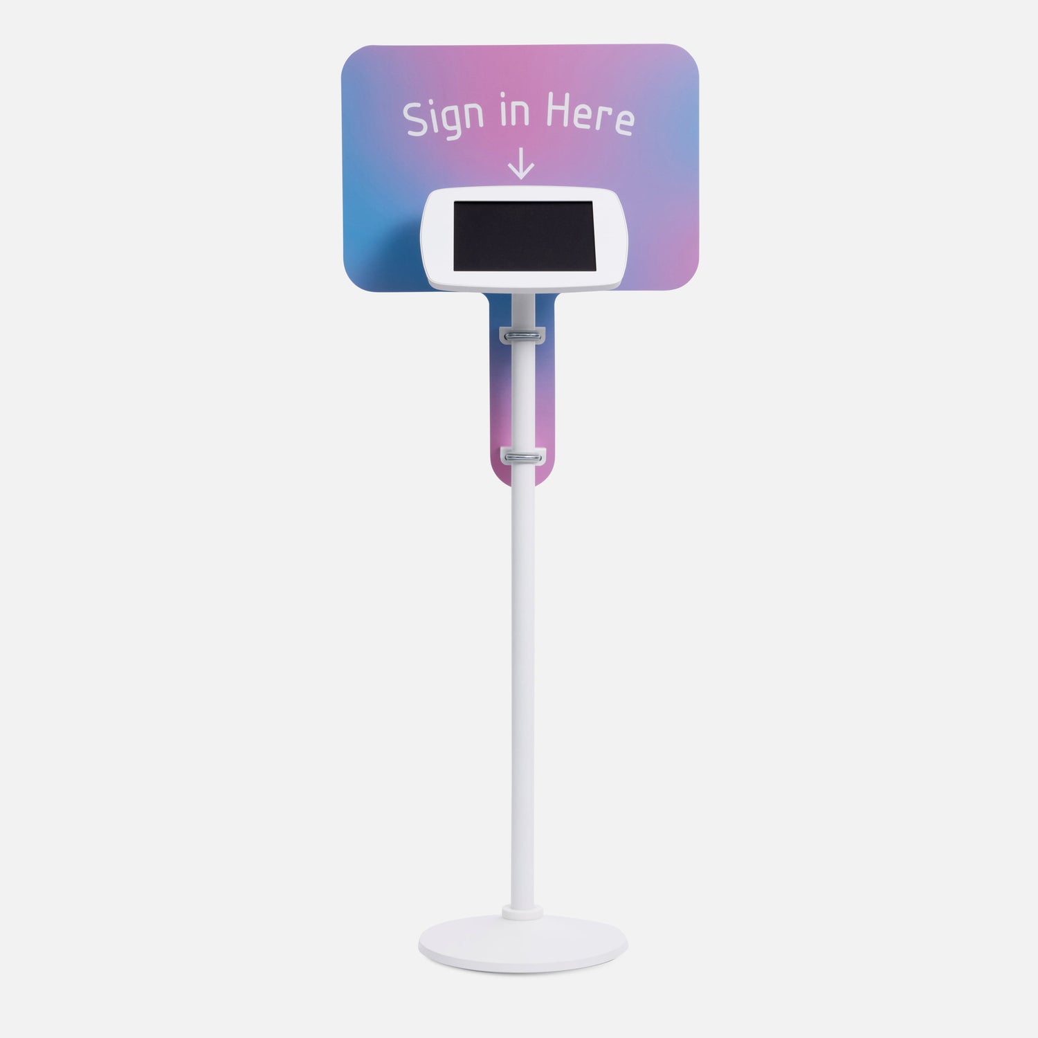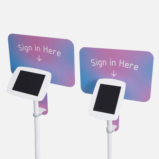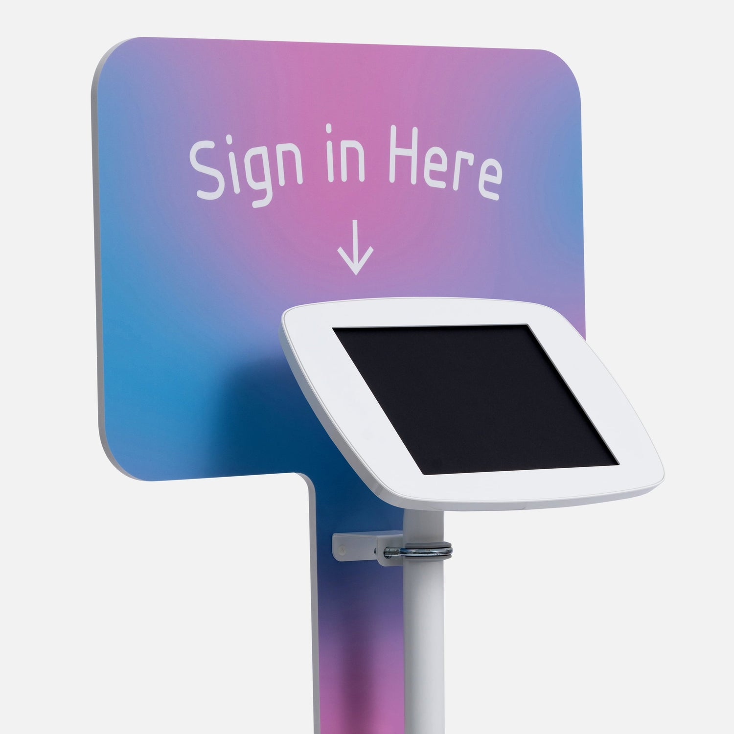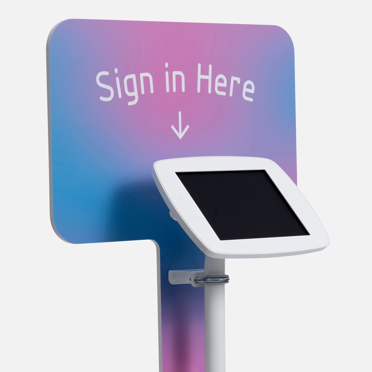 The Bouncepad Original Floorstanding + Placard Board is a secure tablet and iPad floor stand with a big branding board that displays your artwork in full colour on a Foamex board to invite users to interact with your application.