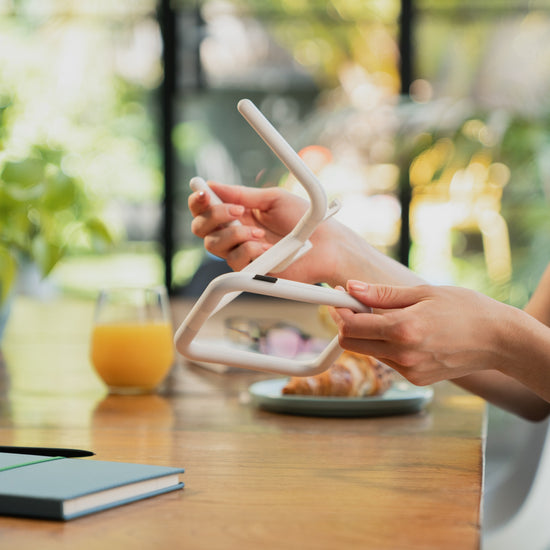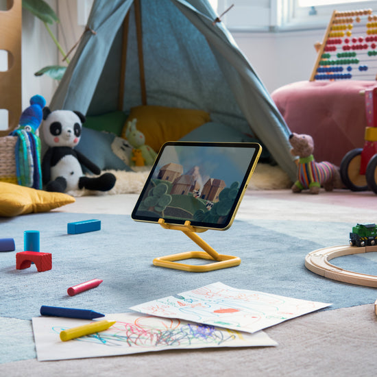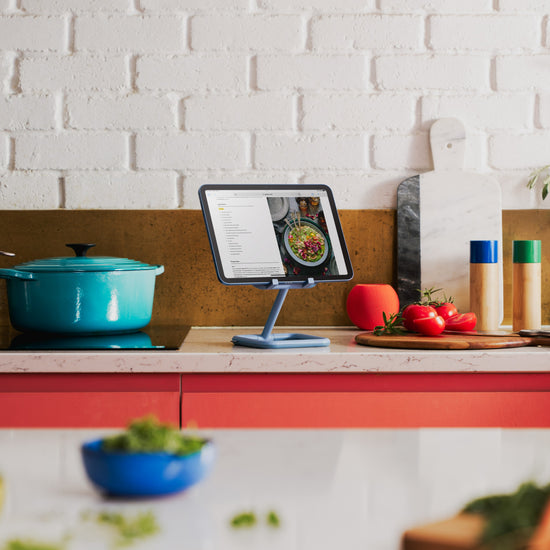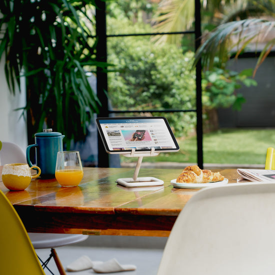 With its 50/50 diecast aluminium and rubber construction, Go is sleek and sturdy whilst protecting your tablet and worktops. Available in four colours, add a splash of colour with Go in blue and yellow, or keep it minimal with white or black.