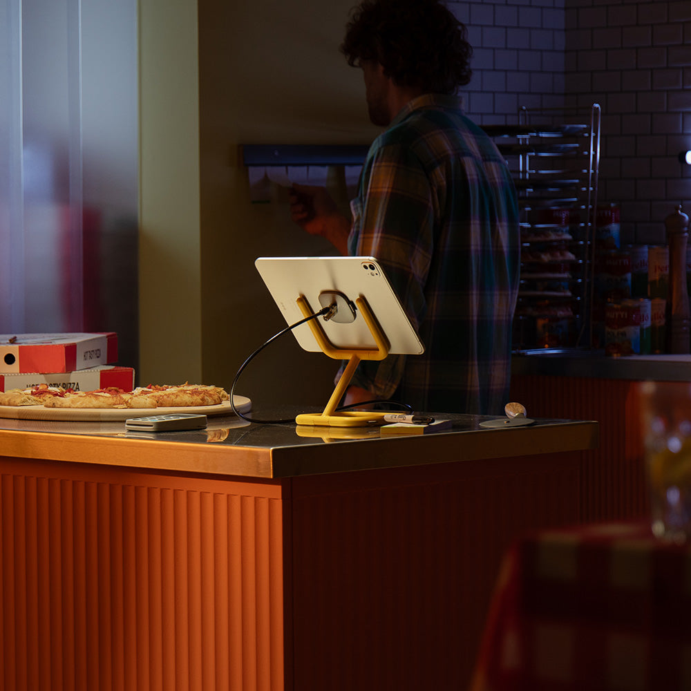 With its 50/50 diecast aluminium and rubber construction, Go is sleek and sturdy whilst protecting your tablet and worktops. The dual hinge mechanism means adjusting the height and angle is a breeze. Available in four colours, add a splash of colour with Go in blue and yellow, or keep it minimal with white or black.