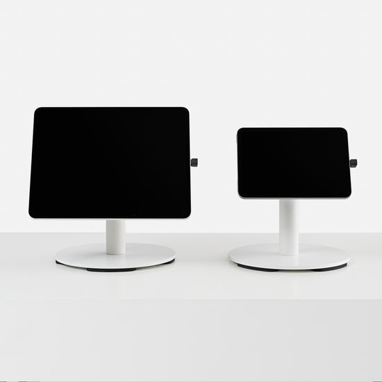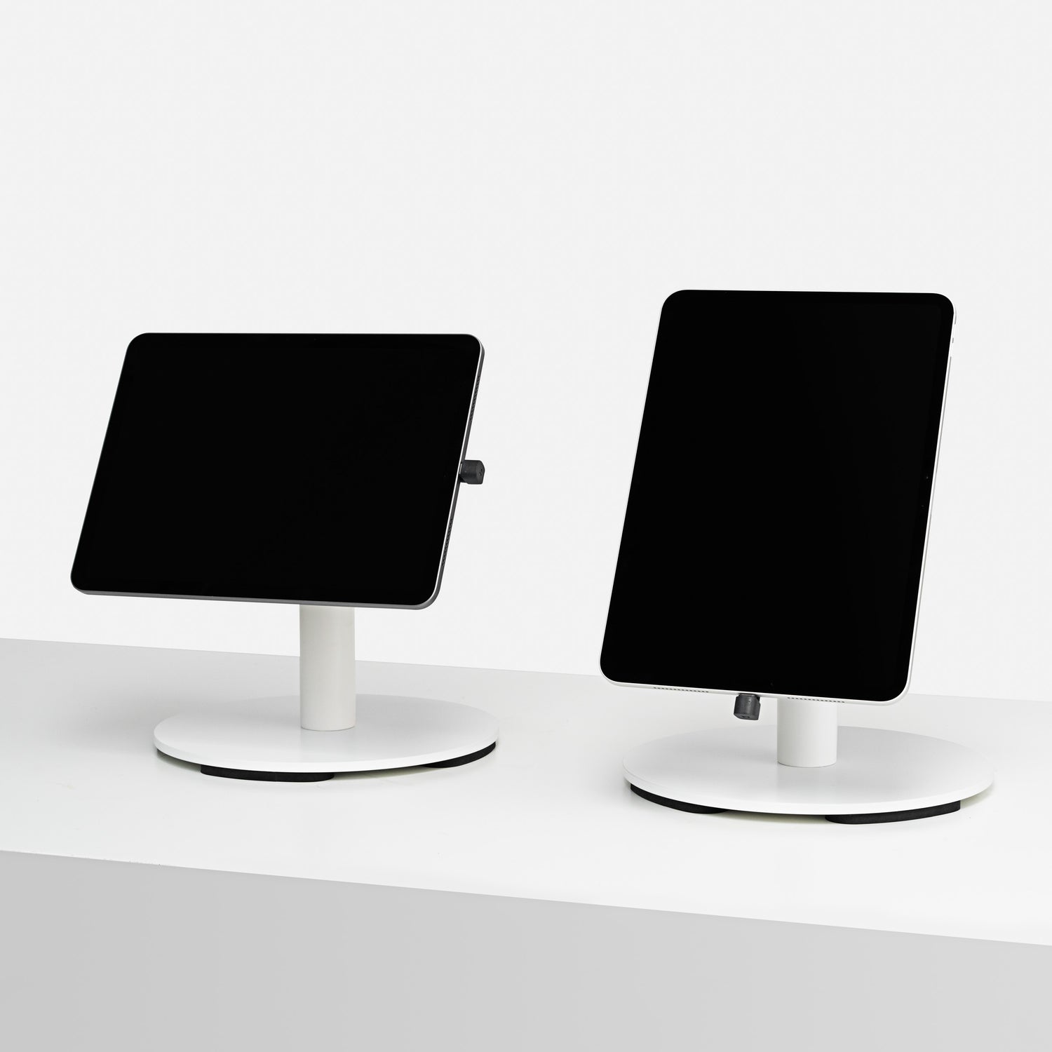 The weighted, solid steel, base balances stability and portability, ideal for installations where you cannot drill holes into the counter. The mounting arm is made from die-cast and machined aluminium components with hard wearing powder coat and anodised finishes to ensure a robust and enduring installation. The tablet mount is injection moulded in super strong glass-filled nylon and high gloss PC/ABS.