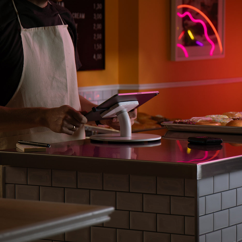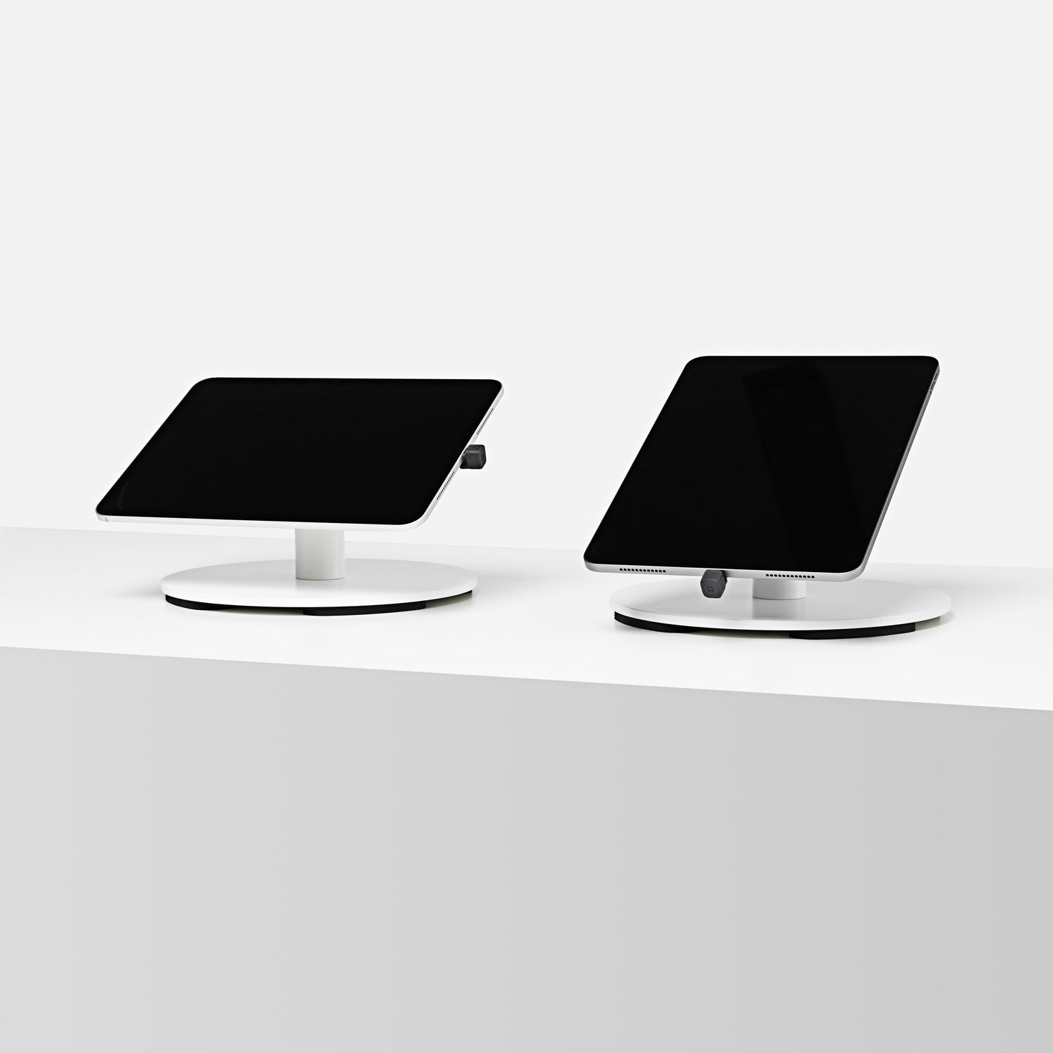 The weighted, solid steel, base balances stability and portability, ideal for installations where you cannot drill holes into the counter. The mounting arm is made from die-cast and machined aluminium components with hard wearing powder coat and anodised finishes to ensure a robust and enduring installation. The tablet mount is injection moulded in super strong glass-filled nylon and high gloss PC/ABS.